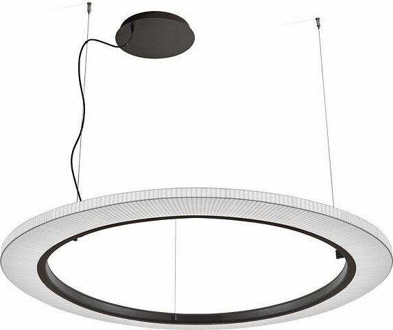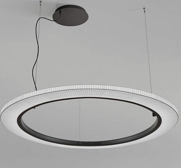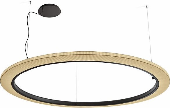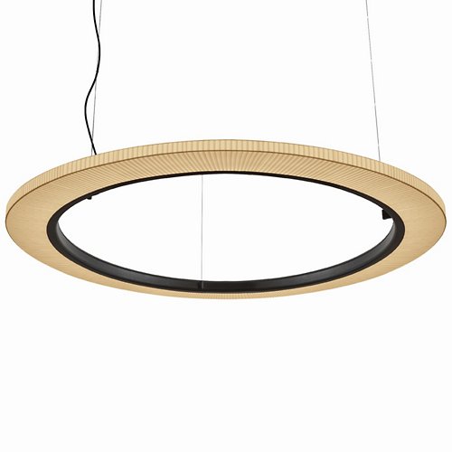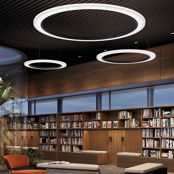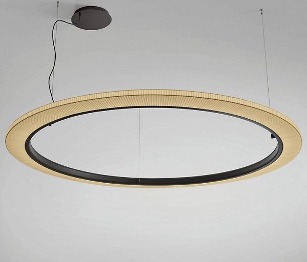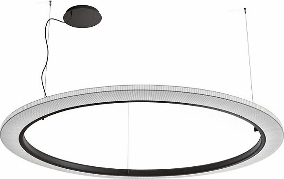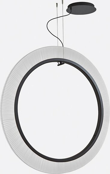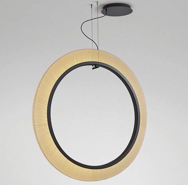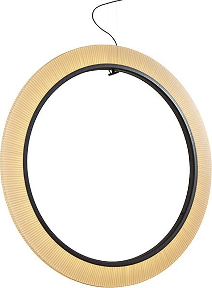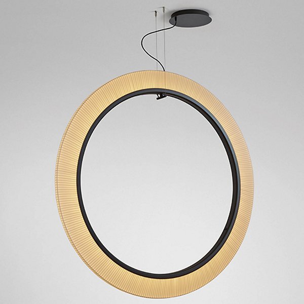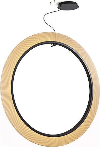 The Roda LED Round Pendant light from Bover is a striking light fixture with a large, cylindrical, ring-shaped shade. The inner contour is surrounded by an aluminum ring containing a continuous circle of LEDs for uniform, filtered light. The warmth of the ribbon is highlighted by the dark ring outlining…