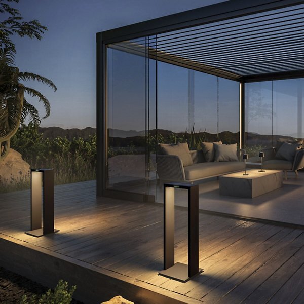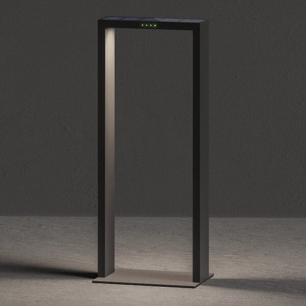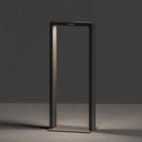The Axis LED Bollard from Zafferano America offers a clean, architectural look with efficient outdoor performance. Designed by Franco Pagliarini, this low-profile bollard is built from tough, die-cast aluminum and finished with a thermosetting epoxy polyester coating able to stand up to salt spray and rugged environents. The narrow, bracket-style frame with integrated LED lighting reflects light downward, providing indirect illumination for paths and garden areas. Equipped with a monocrystalline solar panel, tempered glass, daylight sensor, and polycarbonate diffuser, it can last the night.