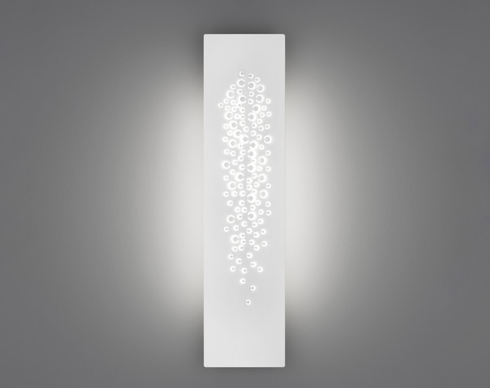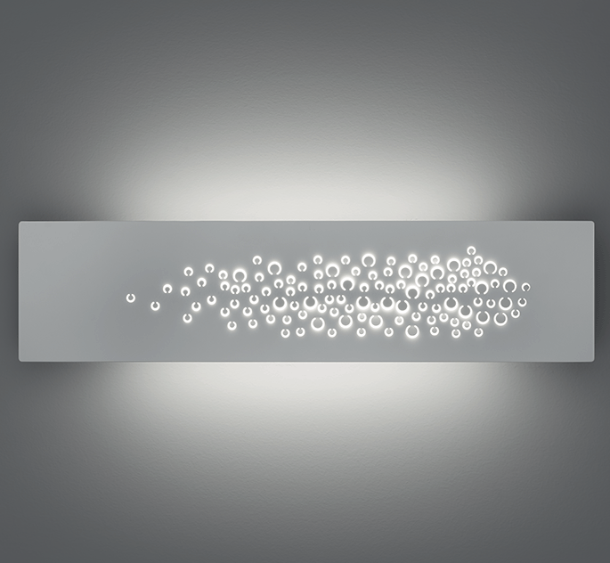 The surfaces multiply reflexes and diffuse light. This results into a varying perception according to the view point, with the concealed or framed perforated area brightened up by the opal glass that hides the LED sources from sight. Opal glass also closes the top and bottom for better light diffusion…