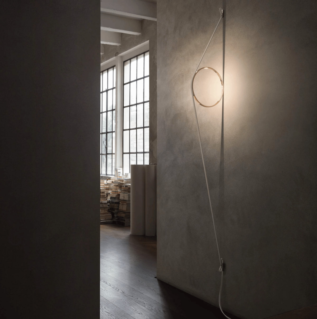 Indirect light wall lighting device with body in calendered, extruded aluminium with galvanised or varnished finish. The special tangent cable, in coloured rubber, provides the power. The cable is fixed to the wall with ABS joints in the same finish as the ring. Dimming via switch pedal on the cable.…